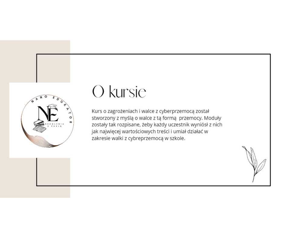 Kurs o zagrożeniach i walce z cyberprzemocą został stworzony z myślą o walce z tą formą przemocy. Moduły zostały tak rozpisane, żeby każdy uczestnik wyniósł z nich jak najwięcej wartościowych treści i umiał działać w zakresie walki z cybreprzemocą w szkole. Kurs jest podzielony na warsztaty i szkolenia. Do kursu dostają państwo 7 gotowych prezentacji w power point na temat: