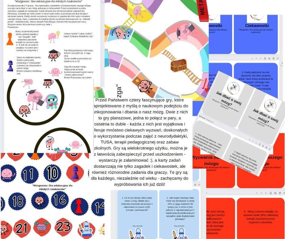 Mózgowiec- Gra planszowa dla 2-4 graczy. Wprowadza uczestników w funkcjonowanie ludzkiego mózgu, uczy jak dbać o nasz mózg oraz pokazuje, co mózg potrafi. Przed uczestnikami są stawiane różne wyzwania, zagadki. Każde wyzwanie to 8 różnych zadań, ciekawostek, zagadek na gotowych kartach do druku.